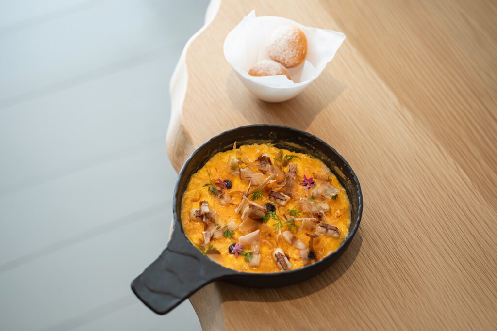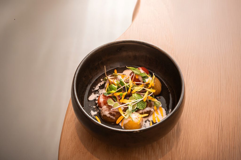 Con estos apetecibles antecedentes nos sentamos a la mesa. Empezamos con chorizo de perro y panes de Alexis García, y seguimos con un primer entrante que eleva un producto tan nuestro como el tomate a la máxima expresión: Tomates aliñados con sardina ahumada y hierbas frescas. ¡Qué sabrosura! Continuamos con Arepa de cochino negro y Tortilla vaga de bacalao, un plato mágico y cinético. Regamos con un blanco Los Loros de Arafo. Luego cae el principal: Costilla de vaca a baja temperatura con jugo de asado, que maridamos con un tinto Benje de Envínate. Qué rico todo.