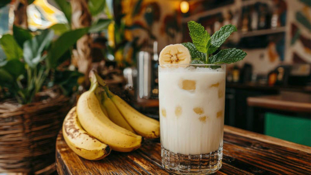 50 ml. de ron añejo / 30 ml. de licor de plátano / 20 ml. de zumo de lima fresco / 15 ml. de sirope de miel de palma / 30 ml. de jugo de aloe vera natural / Dos gotas de Bitter aromático / Hielo.