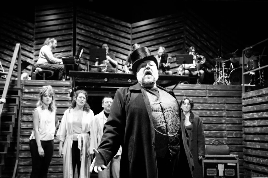 La orquesta se convierte en un elemento narrativo más, interactuando con los personajes e interviniendo en momentos clave, reforzando el efecto de distanciamiento y permitiendo que la música no solo acompañe la acción, sino que también la comente y la critique. Conforman el octeto Gabriel Marijuan (trompeta y percusión), Daniel Rouleau (saxofón alto, clarinete y flauta), Evgeni Riechkalov (trompeta), Roberto Bazán (trombón y contrabajo), Miguel Malla (saxofón tenor, saxofón soprano y clarinete), Nestor Ballestero (teclado), Pablo Novoa (guitarras y banjo) y Carmen Barrantes (chelo)