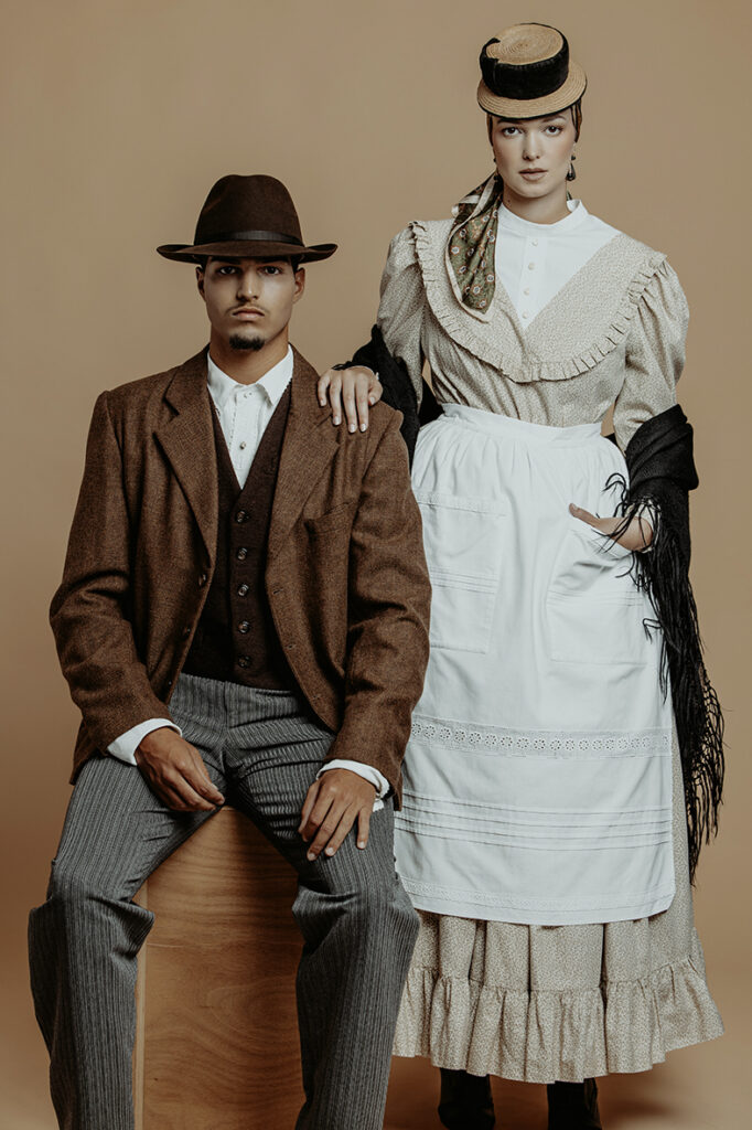 Idea creativa / Daniel Páges – Fotografía / Alfonso Bravo – Peluquería y maquillaje / Juan Castañeda – Indumentarias / Fondos del Consejo Sectorial de la Indumentaria Tradicional de Tenerife – Modelos / Silvia Ivys y Víctor Rodríguez