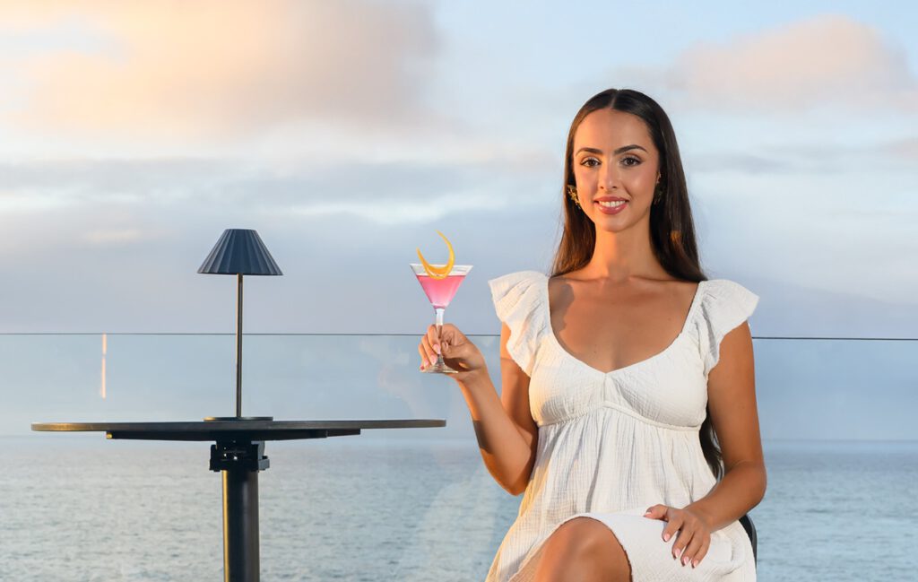 En este escenario de calma, Carla Castro, miss Mundo Tenerife 2023, graduada en Turismo por la Universidad de La Laguna, descubre la magia del UDO Restaurant. Su nombre proviene de la palabra hindi Udana, que significa volar, y da identidad al espacio acristalado de líneas envolventes y atmósfera singular. El techo curvo, cubierto por una tela tensada con efecto espejo, genera un impacto visual tan potente desde el interior como desde el exterior. De él cuelgan luminarias escultóricas en forma de globos flotantes que evocan ligereza y movimiento, reforzando la sensación de estar en pleno vuelo.