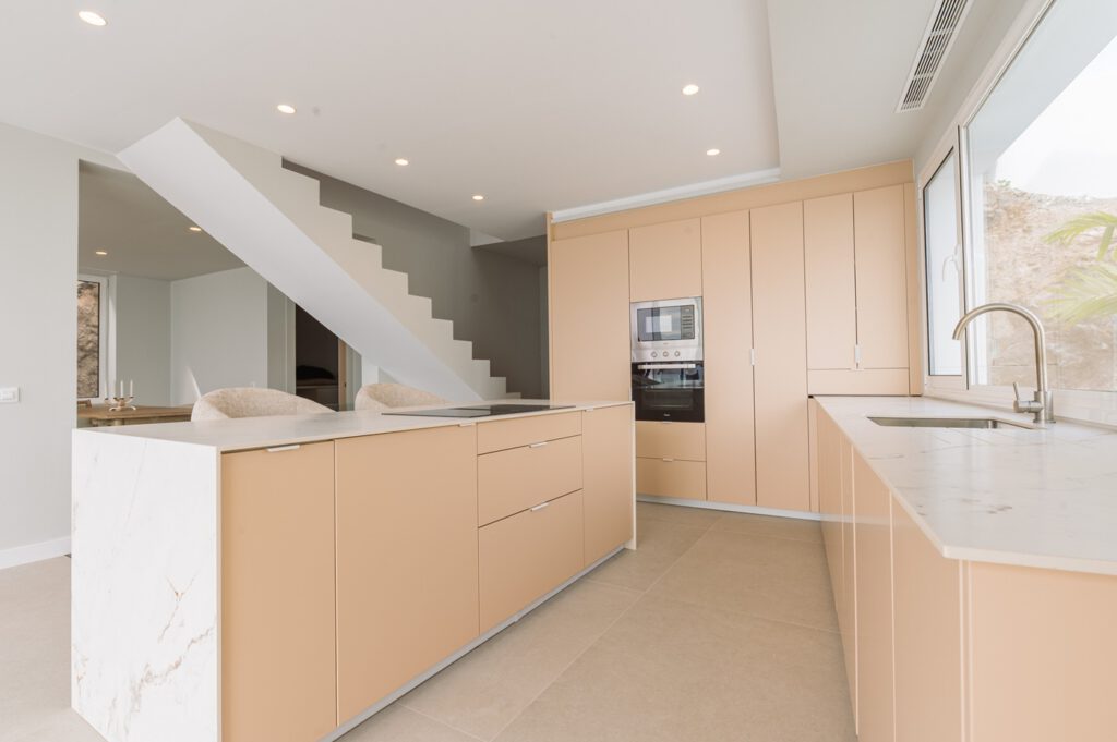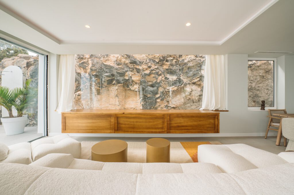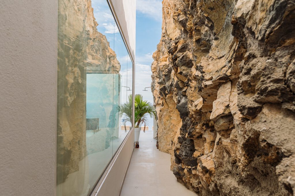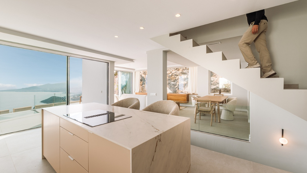La primera planta alberga una cocina abierta y luminosa, con vistas directas a una piscina infinity y al mar, así como un salón principal presidido por amplios ventanales panorámicos. Una pared de roca natural se integra como elemento escultórico, aportando fuerza, autenticidad y carácter al conjunto.