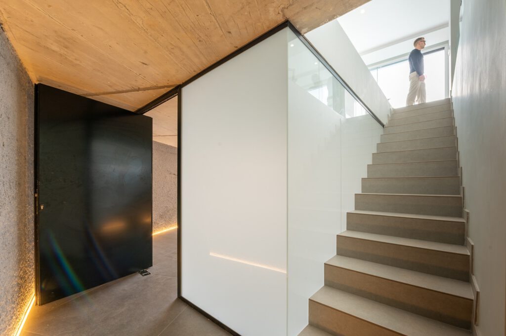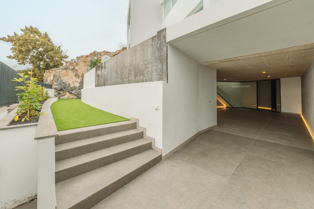 La vivienda se distribuye en tres niveles concebidos para optimizar funcionalidad, confort y un marcado sentido estético. En la planta inferior se encuentra un garaje con capacidad para dos vehículos, además de aparcamiento exterior, salas técnicas y áreas de almacenamiento. Desde este nivel se accede cómodamente a las plantas superiores.